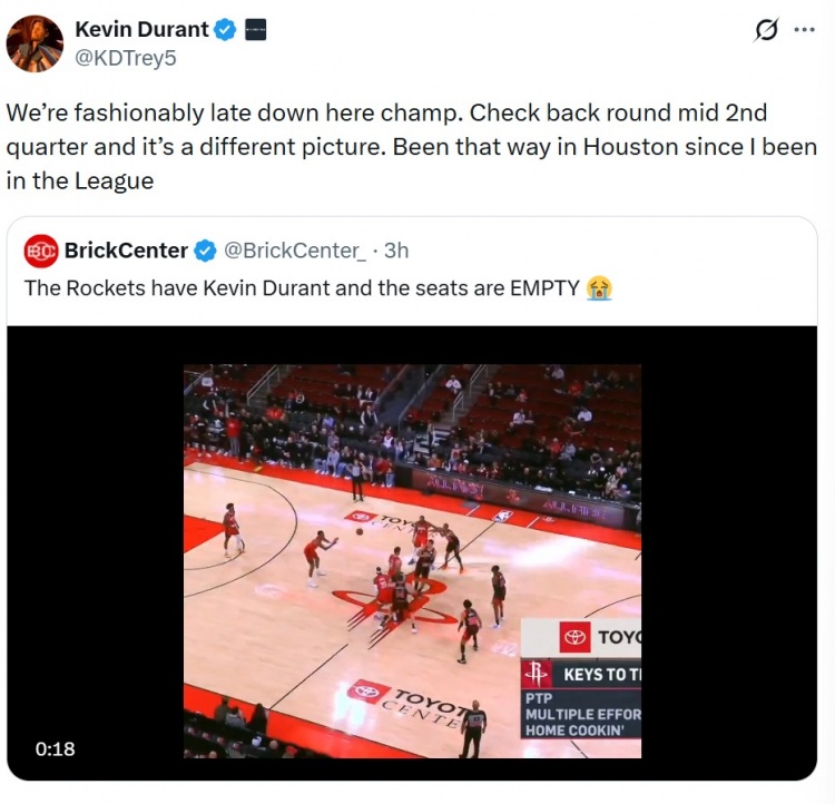 138彩票走势图-主场现大量空座?KD解释:第二节中段才满座 休斯敦一直都是这样